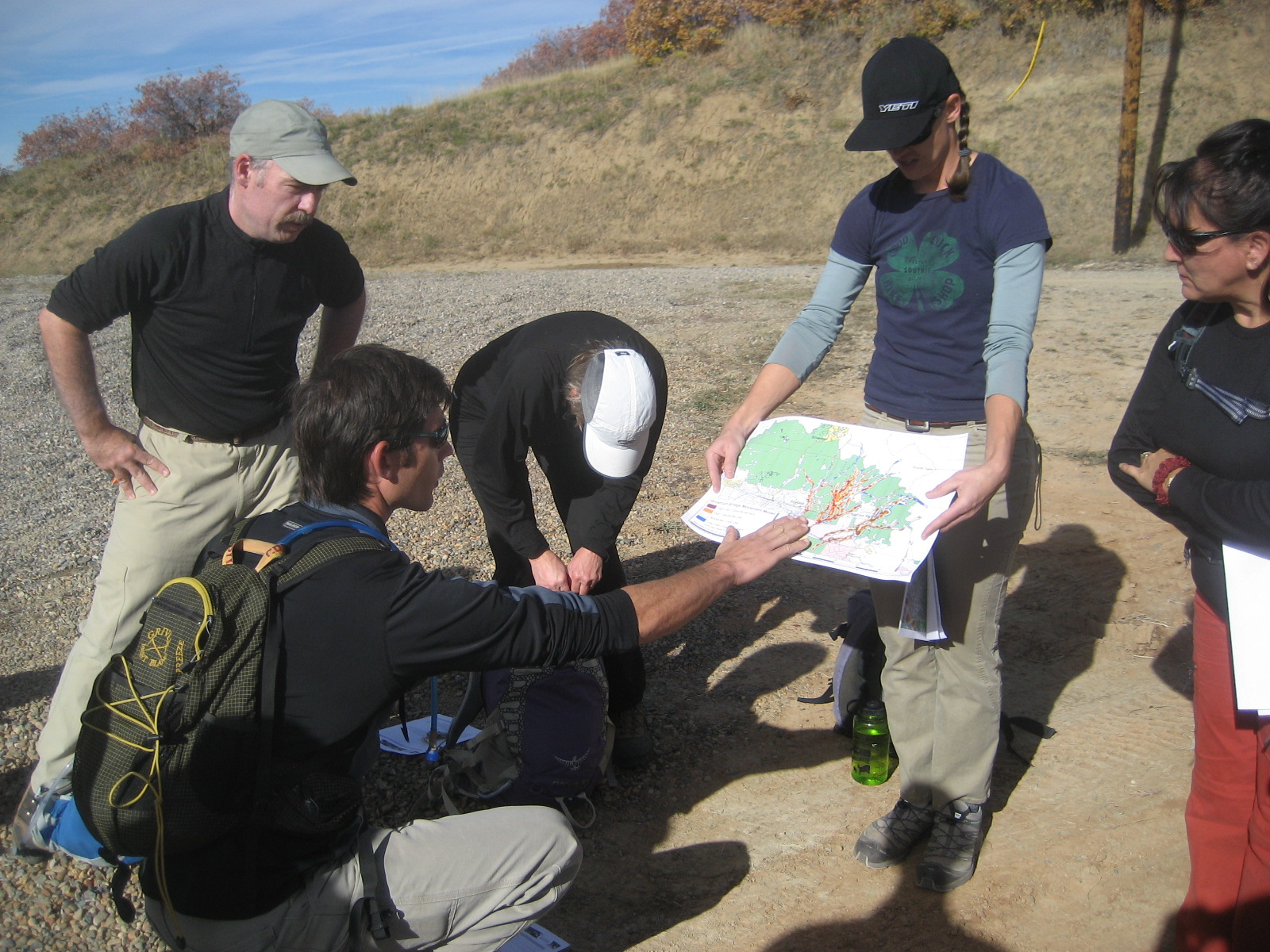 In the first photo, Agata leads a lesson on disposing of waste properly by demonstrating how to dig a cathole. The second photo shows the crew preparing for departure into the Geneva Wilderness Area with a sense of humor and excitement for the trip ahead.