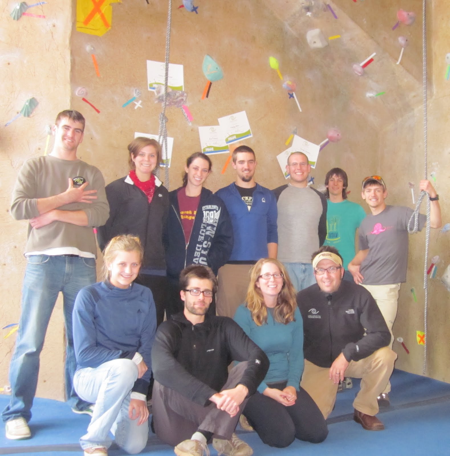 The course was held on campus due to early spring wintry weather, but the flow of the weekend was educational and focused thanks to the efforts of the group. The office of Stout Adventures doubled as a classroom as well as a recreational opportunity as seen in the group photo at the rock wall.