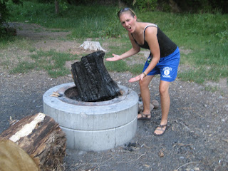 Having a "camp-fire" during a fire ban is fairly easy to accomplish. Any number of small battery operated lanterns can be set at varying heights in a "fire ring". You can also use those small battery powered lights which look like votive candles and intersperse them among some small branches to make it look more fire-like. S'mores can be made ahead of time in the oven by wrapping the graham crackers, marshmallows and chocolate in aluminum foil and baking them in the oven. To re-heat, use a camp stove and griddle.